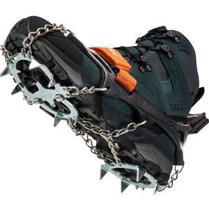 Ideale su ghiaccio, neve dura e sottobosco ghiacciato grazie al sistema a punte a lunghezza differenziata Ramponi anteriori snodati per prevenire gli accumuli di neve e ghiaccio